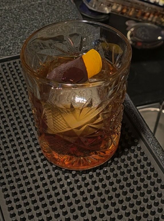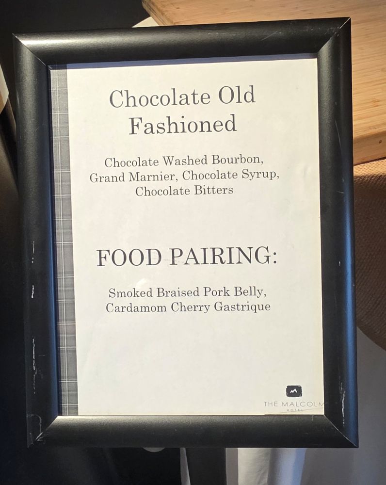 Chocolate-washed bourbon, Grand Marnier, chocolate syrup, chocolate bitters, served over ice