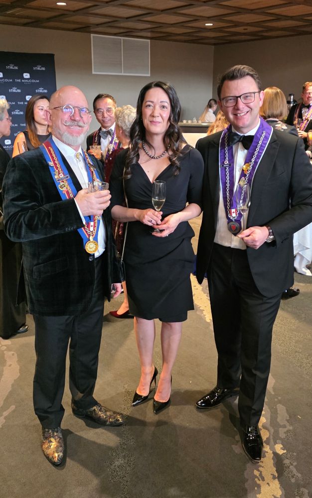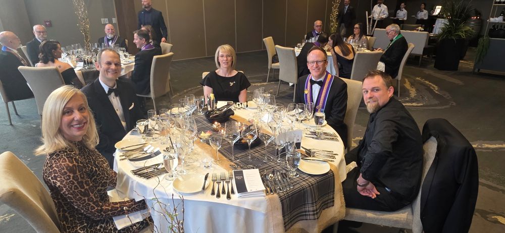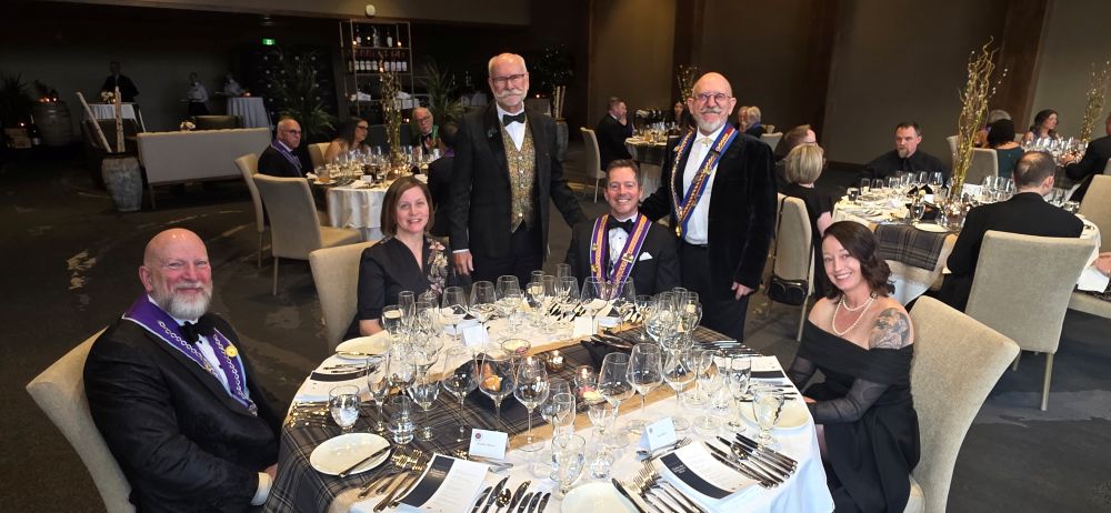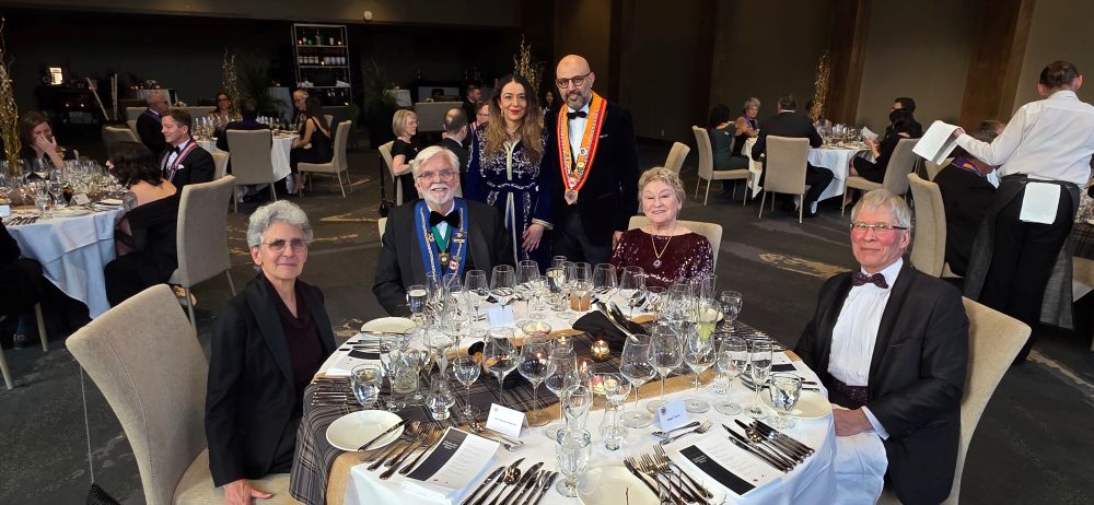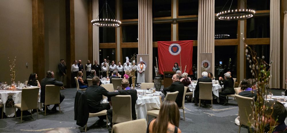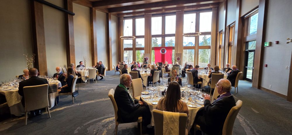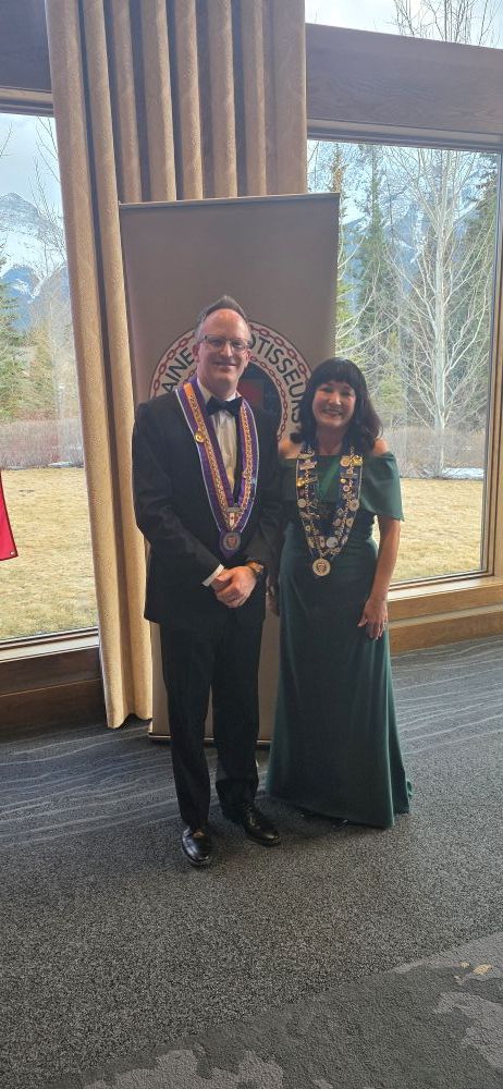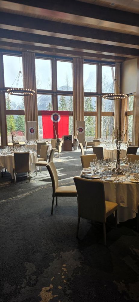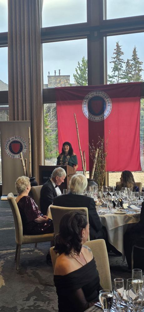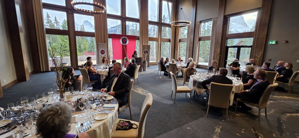 Toni-Marie Ion-Brown, Chancelière du Canada, welcomed us to the Malcolm, and enthusiastically thanked our hosts, along with ensuring we admired the view out of the picture windows of the Three Sisters. David Jones of Everwild was presented with a 10-year commander pin. Toni then welcomed our guests for the evening, reminded us of the rules of the table and the evening commenced.