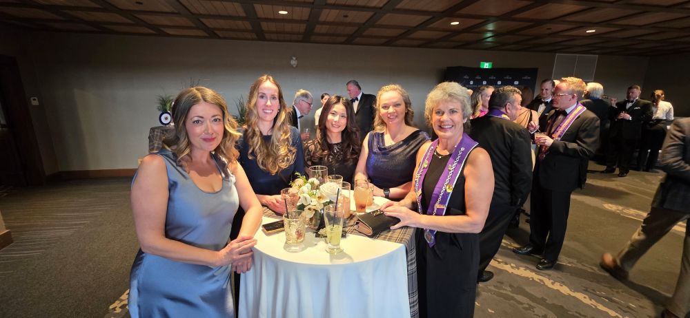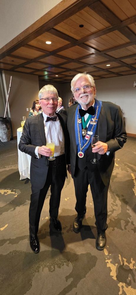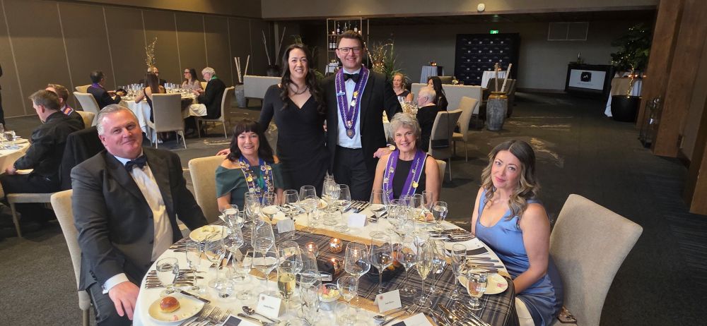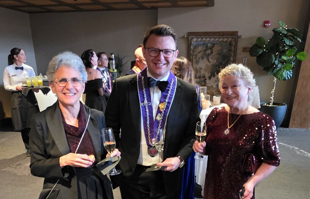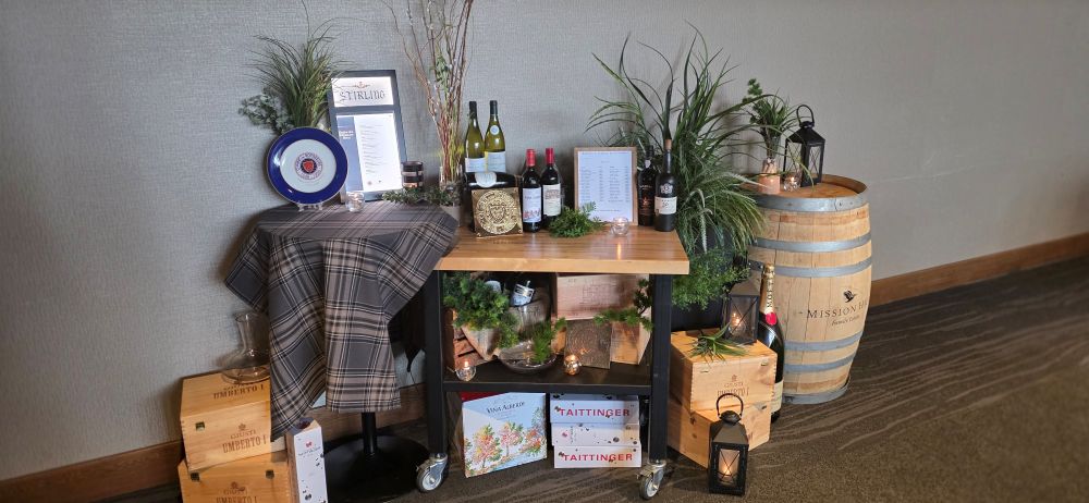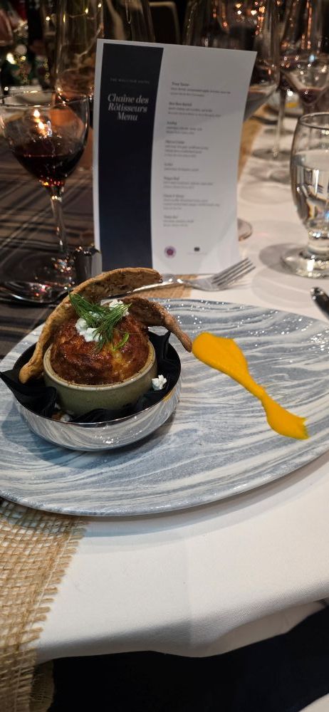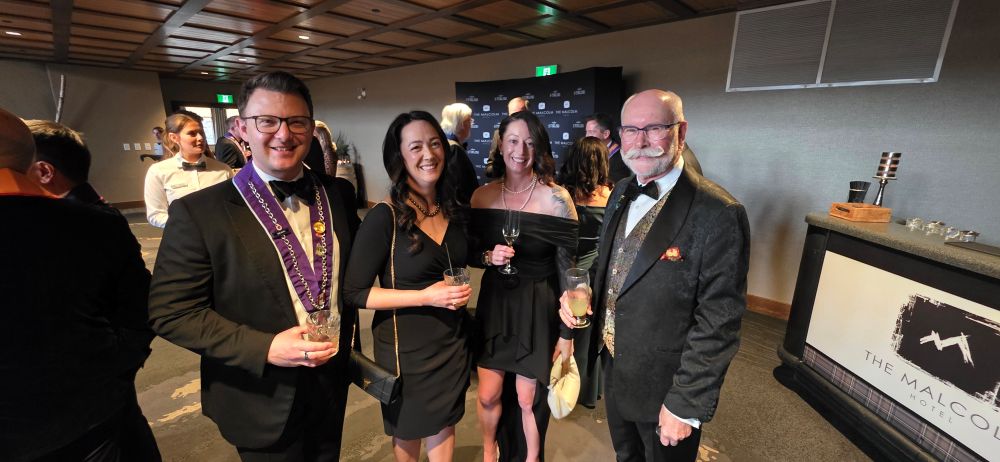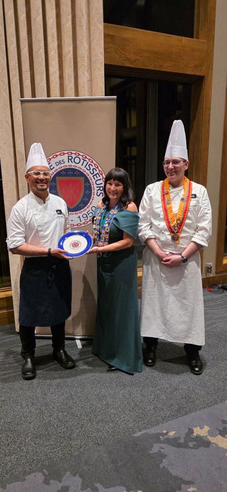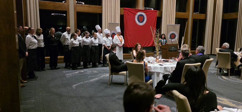 Toni-Marie Ion-Brown, Chancelière du Canada, welcomed us to the Malcolm, and enthusiastically thanked our hosts, along with ensuring we admired the view out of the picture windows of the Three Sisters. David Jones of Everwild was presented with a 10-year commander pin. Toni then welcomed our guests for the evening, reminded us of the rules of the table and the evening commenced.