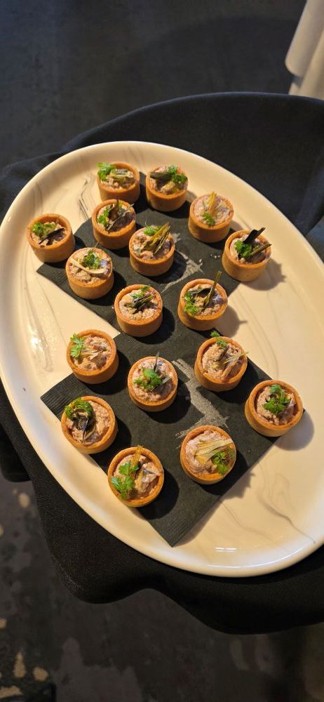 We were welcomed to the Edinburgh Castle Room by servers holding trays of Taittinger Champagne. Thank you to Linda, and Pacific Wines and Spirits. In addition, our hosts provided one mocktail and two cocktails. A selection of hors d’oeuvres was passed around for the guests to nibble on before dinner commenced.