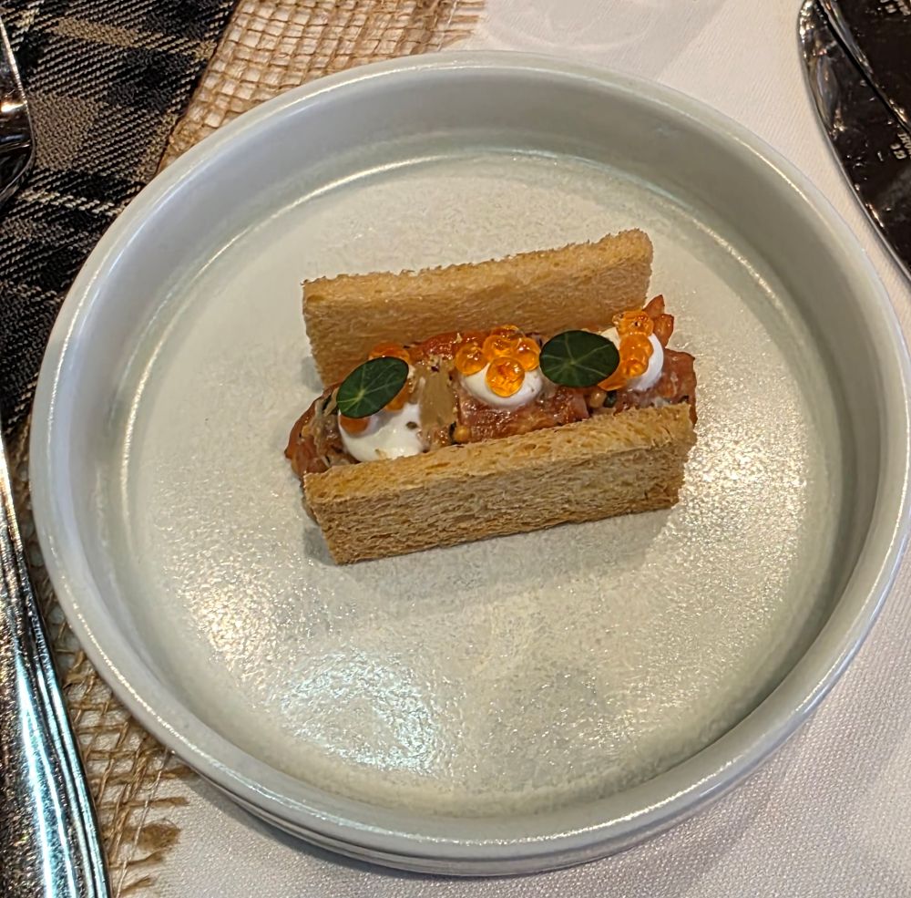 Trout, fennel pollen, compressed apple, brioche, trout roe