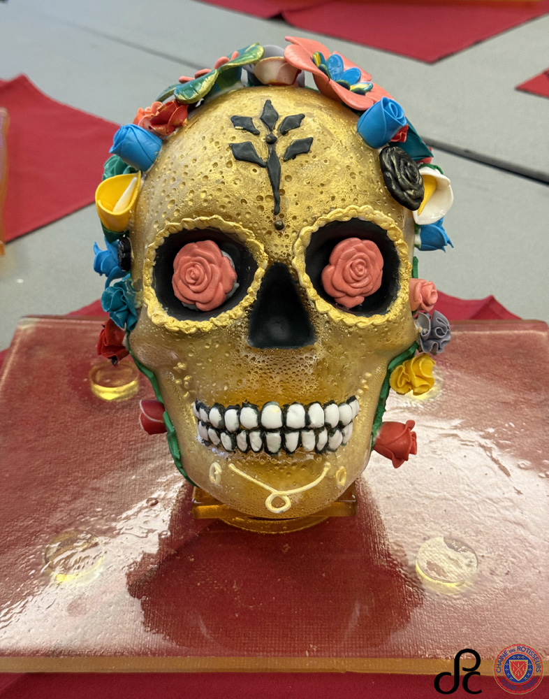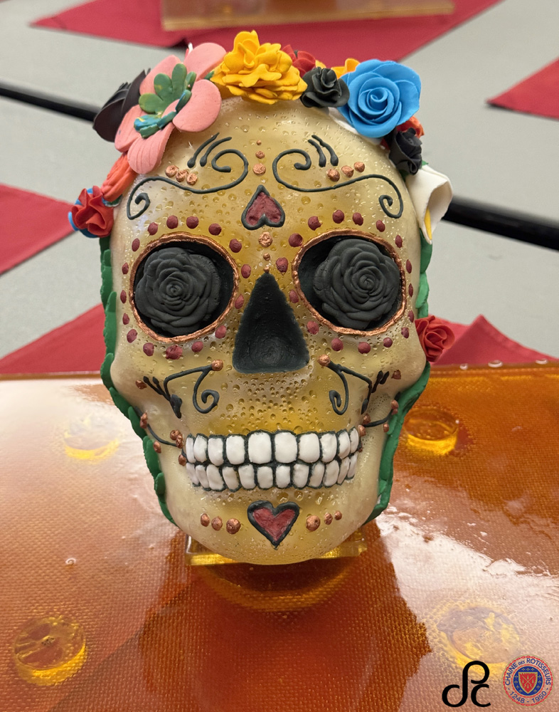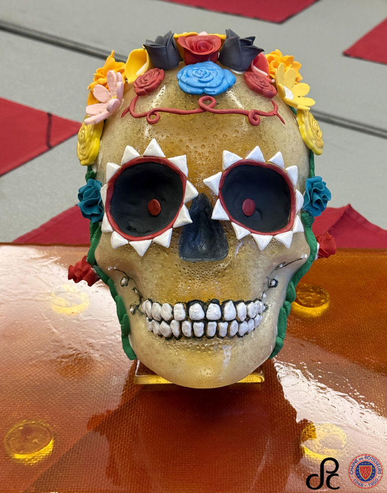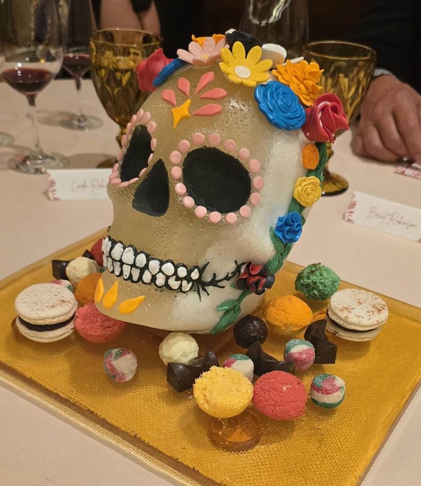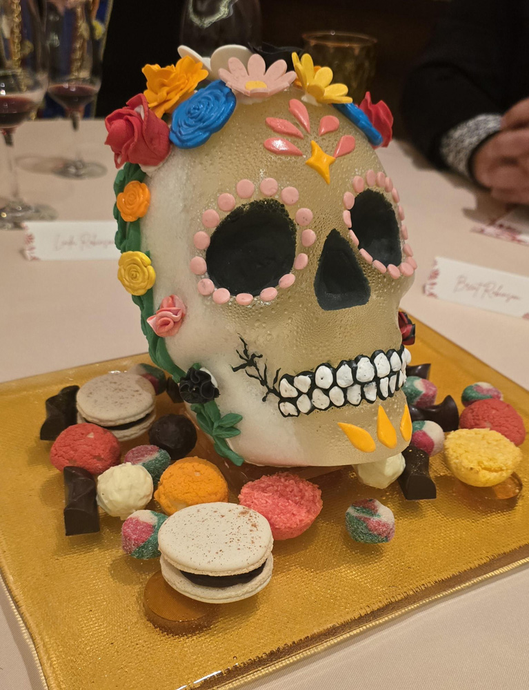 There were a few standouts of this evening’s dinner, beginning with the table centres, of hydrangeas, astilbe, and dahlias in terra cotta pots, Chef Joanna presented each course, and explained what it was to entail, such as the Los Jaivas Timble, where the breadsticks were drumsticks. Luis followed Chef Joanna and described each of the wine pairings for the evening. The sable fish was another favourite of the evening, with a fish skeleton cracker, and this course’s wine pairing was a match made in heaven. A couple of other wine highlights were the Caparzo Brunello di Montalcino 2017 that was in 5-liter bottles, and the Close de la Marechale from 2005. The final showstopper was dessert presented as, a day of the dead decorated sugar skull featuring candies, and chocolates.