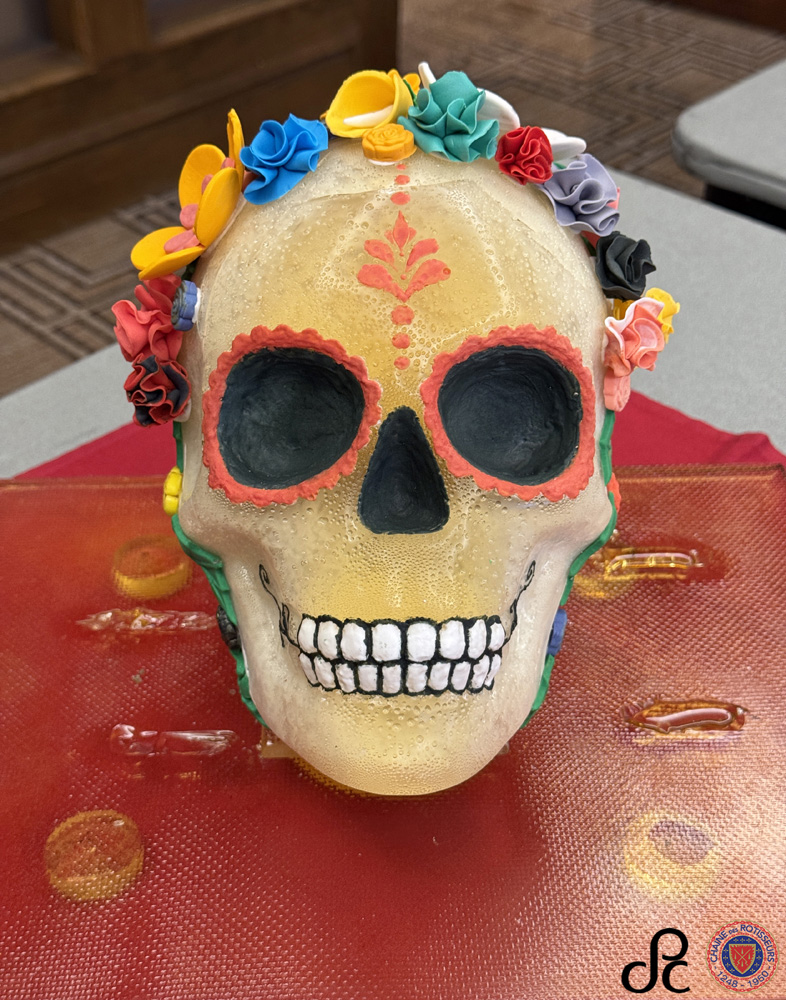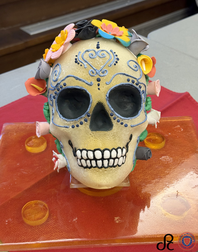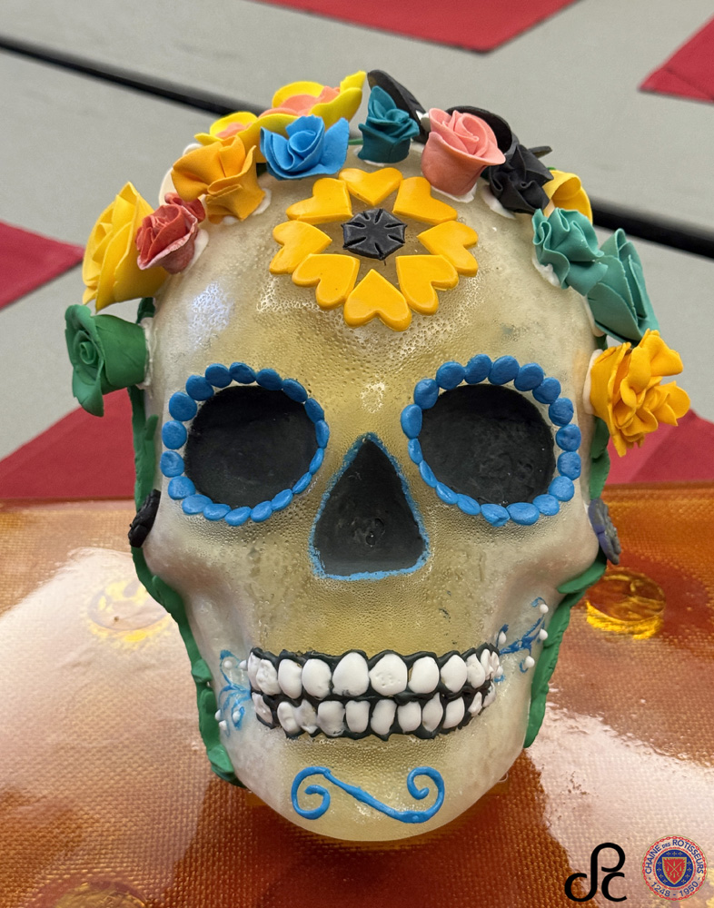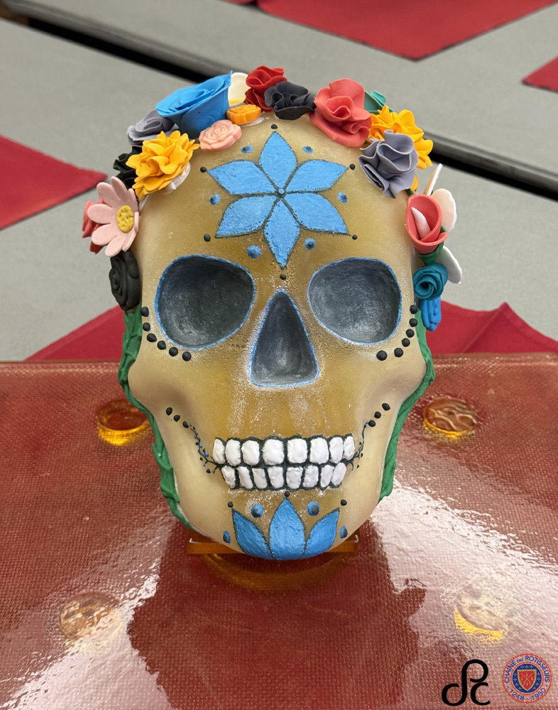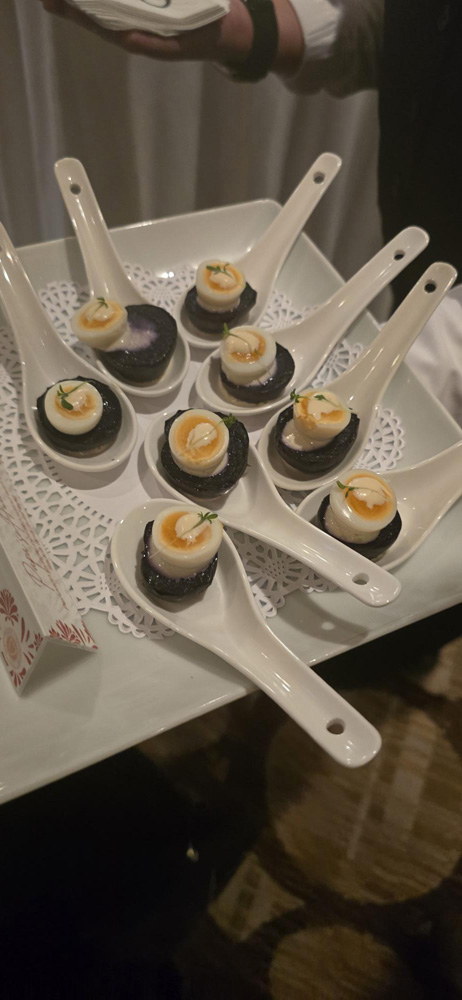 There were a few standouts of this evening’s dinner, beginning with the table centres, of hydrangeas, astilbe, and dahlias in terra cotta pots, Chef Joanna presented each course, and explained what it was to entail, such as the Los Jaivas Timble, where the breadsticks were drumsticks. Luis followed Chef Joanna and described each of the wine pairings for the evening. The sable fish was another favourite of the evening, with a fish skeleton cracker, and this course’s wine pairing was a match made in heaven. A couple of other wine highlights were the Caparzo Brunello di Montalcino 2017 that was in 5-liter bottles, and the Close de la Marechale from 2005. The final showstopper was dessert presented as, a day of the dead decorated sugar skull featuring candies, and chocolates.