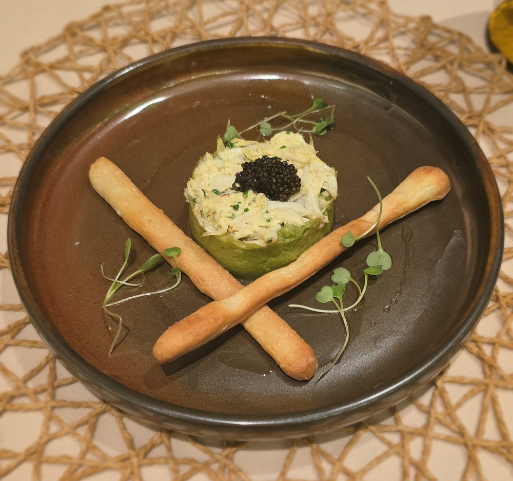 Avocado, crab with crustacean aioli, Acadian wild sturgeon caviar, bread sticks