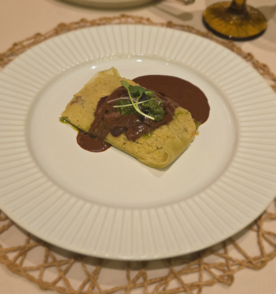 Corn tamale, duck confit, mole poblano & pepita pesto