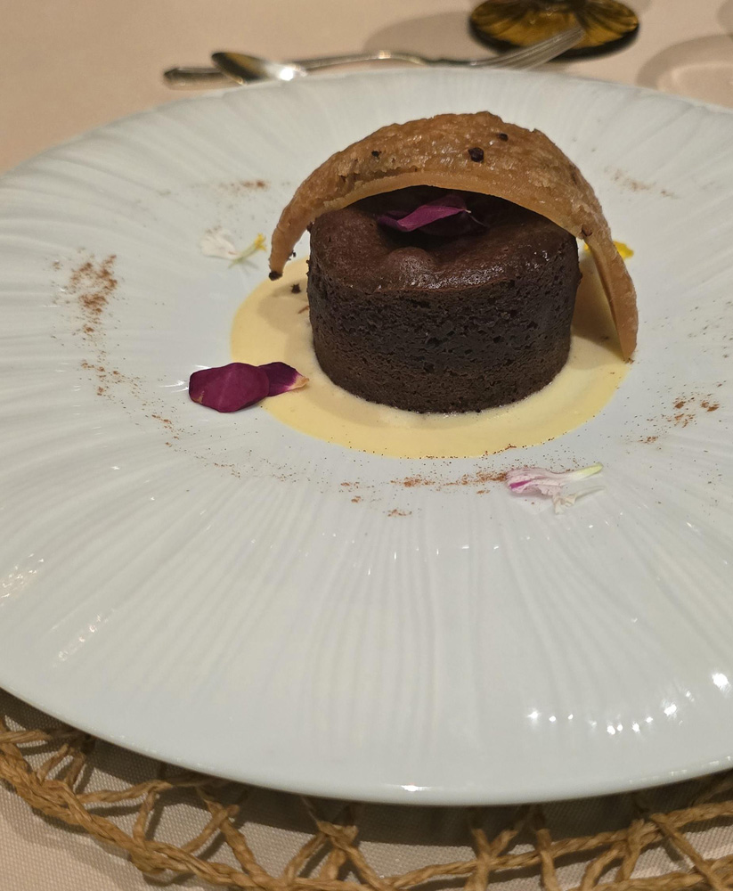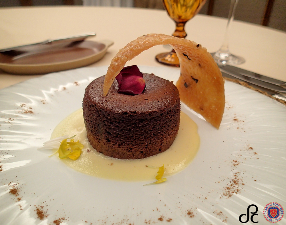 Spiced chocolate molten cake, horchata crème anglaise, rose water, cocoa nib brandy snap